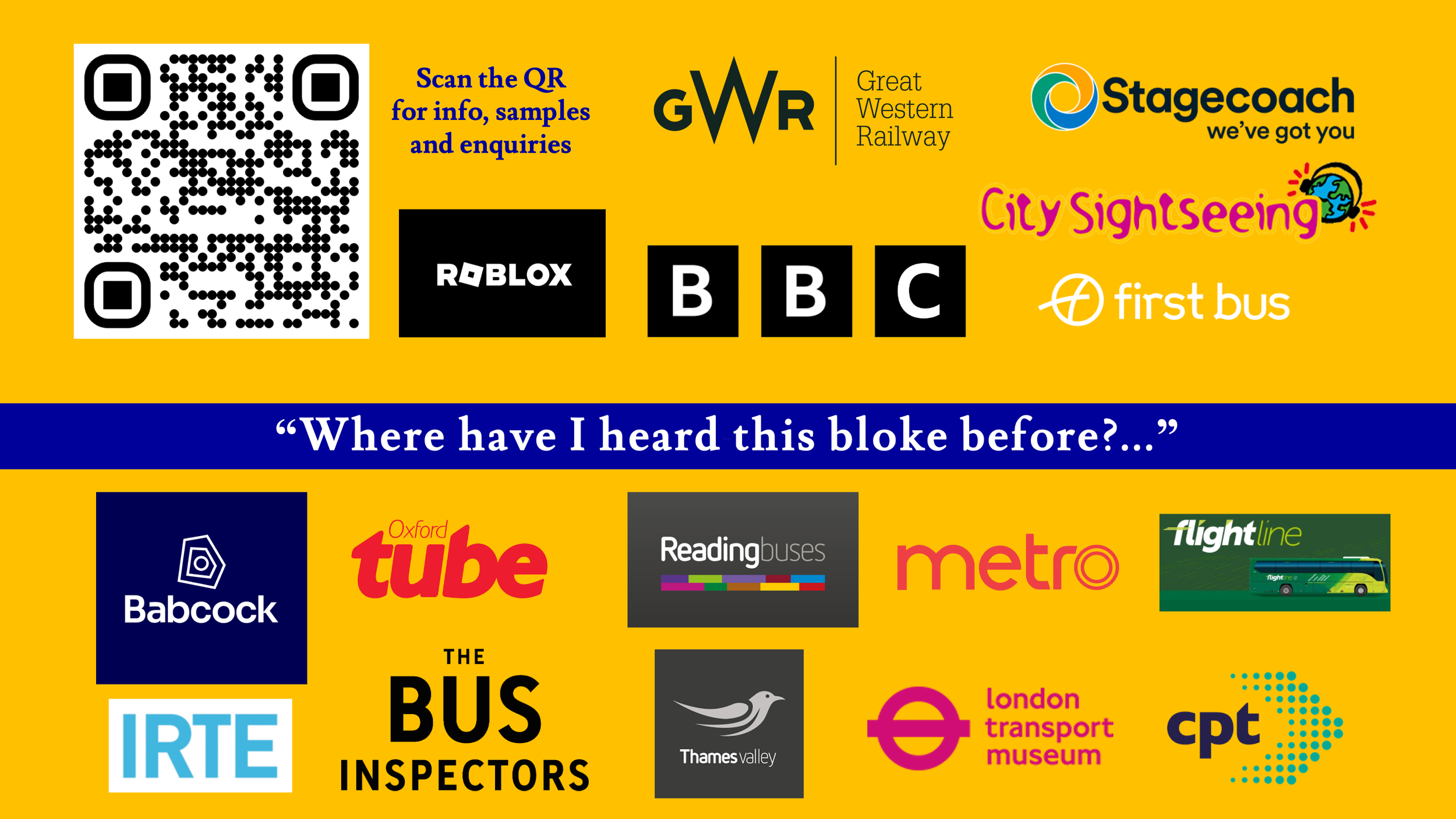 You’ll also find David’s voice on-board the award-winning Reading Buses network, the famous Oxford Tube coaches, Heathrow’s Flightline network and many more besides.